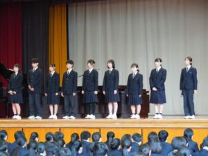 続いて終業式では、校長が式辞で目標を立てて取り組むことの大切さを述べ、その後全員で校歌を斉唱しました。
