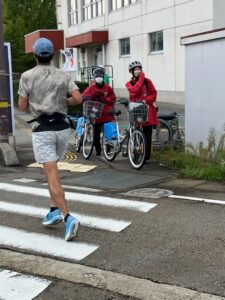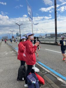 それぞれ、救護所スタッフ・固定AED隊と移動AED隊に分かれ、マラソンコースでのランナーの観察や体調不良と思われるランナーへの声がけや対応を行いました。