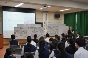 5月19日(金曜日)6限、2学年総合学科・総合的な探究の時間において、本校が所在する南富山のまちづくりを考える会の代表である松山朋朗さんを招き、南富山のまちづくり活動に関する講演を実施しました。